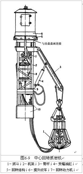 中心回轉(zhuǎn)抓巖機(jī)是一種大斗容抓巖機(jī),它直接固定在鑿井吊盤上,以壓風(fēng)作為動(dòng)力,該設(shè)備具有使用范圍廣、適應(yīng)性強(qiáng)、設(shè)備利用率高、動(dòng)力單一、結(jié)構(gòu)緊湊、占用井筒面積不大,便于井筒布置、安全可靠、操作靈活、維護(hù)方便等優(yōu)點(diǎn),目前在煤炭礦山得到了普遍的使用。該機(jī)由抓斗、提升機(jī)構(gòu)、回轉(zhuǎn)機(jī)構(gòu)、變幅機(jī)構(gòu)、支撐系統(tǒng)和機(jī)架等部件組成,見(jiàn)圖6-9。