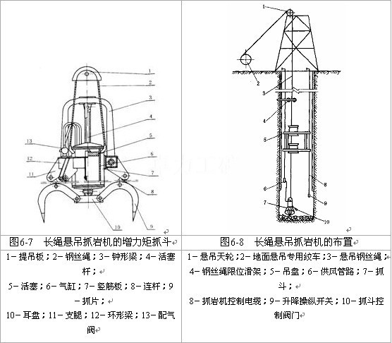 為了安全,地面可增設(shè)鑿井絞車,以便對(duì)抓巖機(jī)進(jìn)行輔助懸吊,通??膳c傘鉆適用一臺(tái)懸吊絞車。