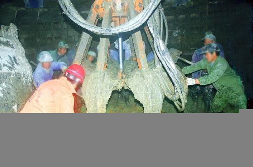 4.抓巖機(jī)下到井底后,使抓巖機(jī)靠在靠近抓巖機(jī)口處的模板上,確認(rèn)靠穩(wěn)后通知絞車司機(jī)準(zhǔn)備奪鉤,下放抓巖機(jī)懸吊鋼絲繩,作業(yè)人員把懸吊鋼絲繩掛在抓巖機(jī)上進(jìn)行奪鉤。