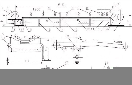 1、傳動(dòng)滾筒;2、頭罩;3、輸送帶;4、槽型調(diào)心托輥;5、槽型托輥;6、緩沖托輥;7、導(dǎo)料槽;8、螺旋拉緊裝置;9、改向滾筒;10、尾架;11、空段清掃器;12、下平調(diào)心托輥;13、下托輥;14、中間架;15、中間支腿;16、改向滾筒;17、頭架;18、彈簧清掃器;19、垂直拉緊裝置;20、犁式卸料器;21、卸料車(chē);22、車(chē)式拉緊裝置