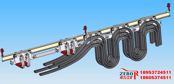 和水管沿著巷道吊掛和移動。該裝置避免了井下電纜凌亂擺放,減少了電纜的占用空間與電纜的移動次數(shù),避免了人工