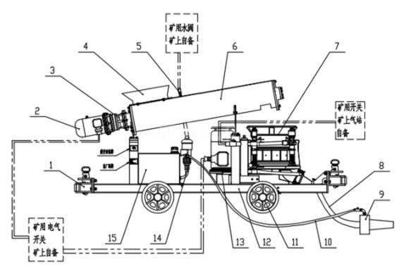 1、碰頭 2、電動(dòng)機(jī) 3、減速機(jī) 4、進(jìn)料斗 5、進(jìn)水管路 6、攪拌機(jī) 7、噴射機(jī) 8、輸料管 9、噴頭10、輸液膠管 11、礦車輪對(duì) 12、車架 13、電動(dòng)機(jī) 14、速凝劑泵 15、速凝劑箱
